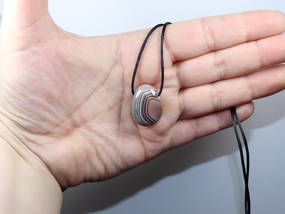 The necklace with Botswana agate will be individualized according to your specifications. You have the choice between a black cord with a closure made of stainless steel or a chain made of silver 925.