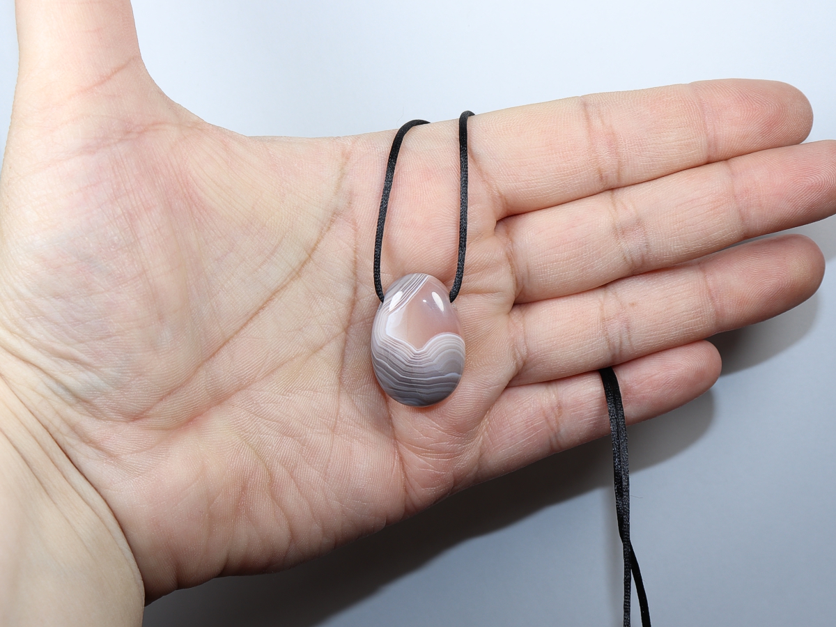 The necklace with Botswana agate will be individualized according to your specifications. You have the choice between a black cord with a closure made of stainless steel or a chain made of silver 925.