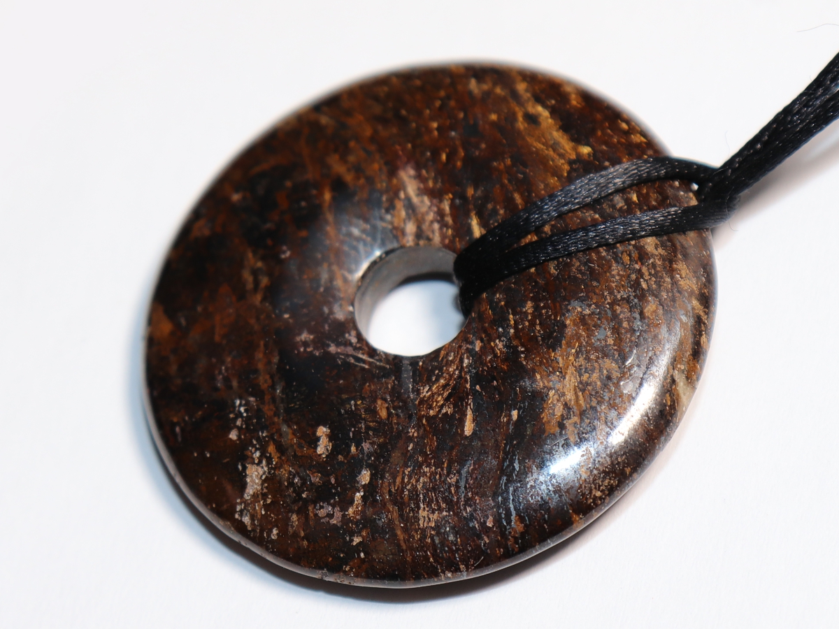 The necklace with the donut made of bronzite and a black cord will be individualized according to your specifications. The closure is made of stainless steel.