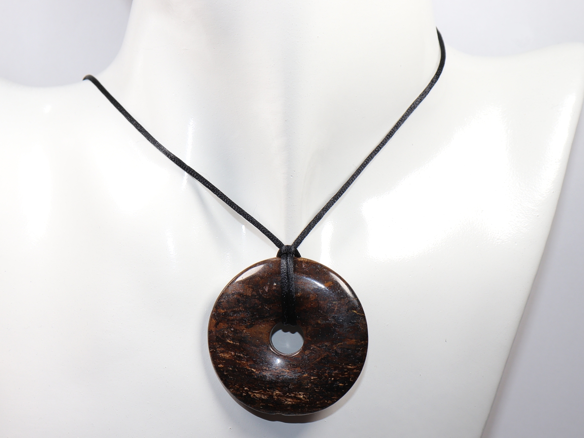 The necklace with the donut made of bronzite and a black cord will be individualized according to your specifications. The closure is made of stainless steel.