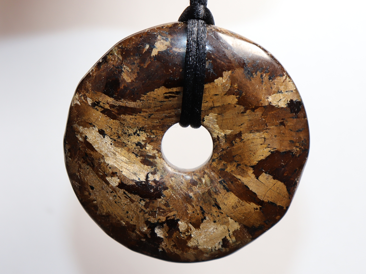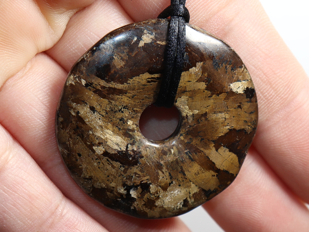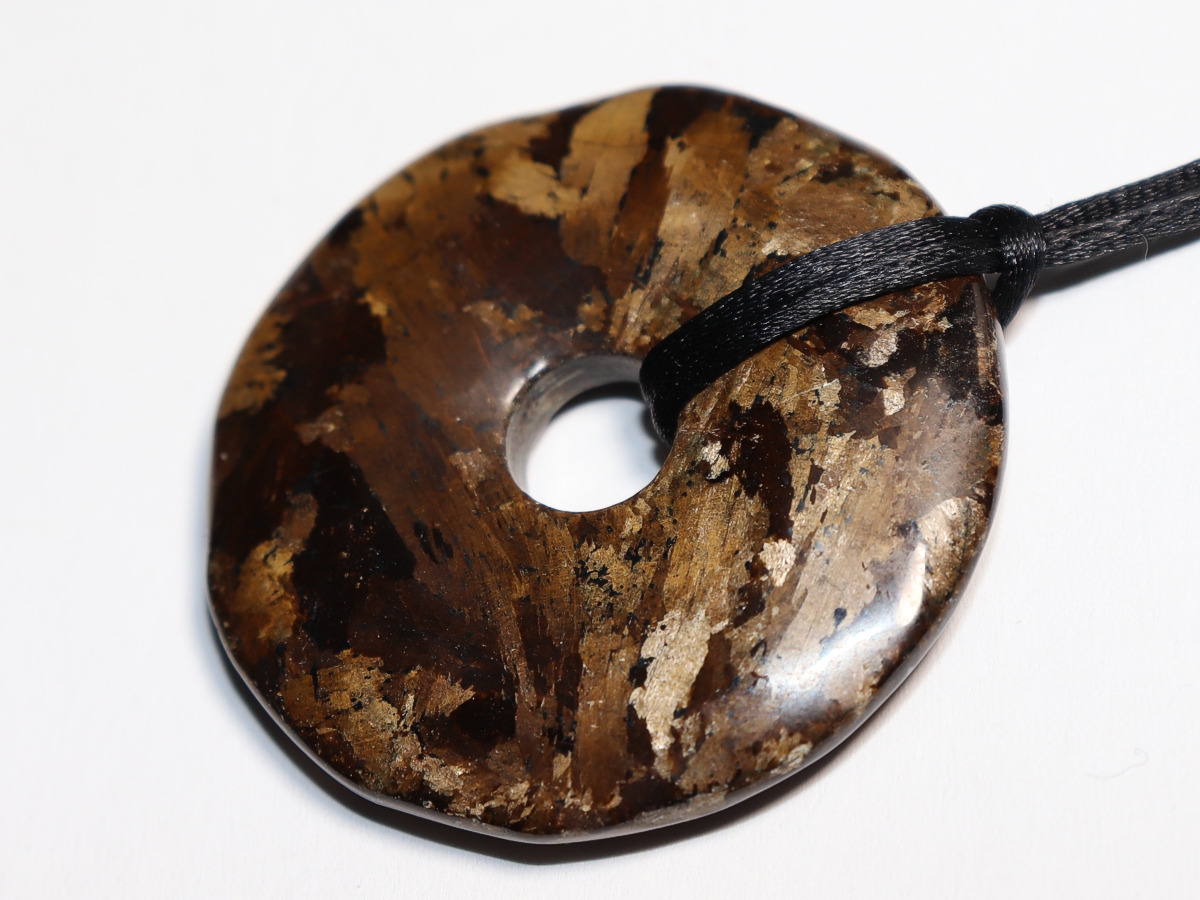 The necklace with the donut made of bronzite and a black cord will be individualized according to your specifications. The closure is made of stainless steel.