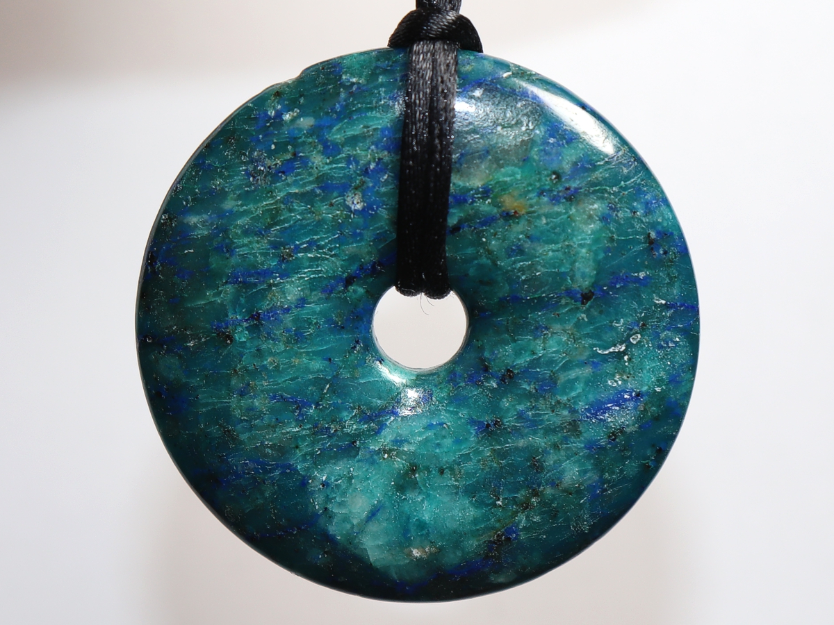 The necklace with the donut made of chrysocolla-lapis and a black cord will be individualized according to your specifications. The closure is made of stainless steel.