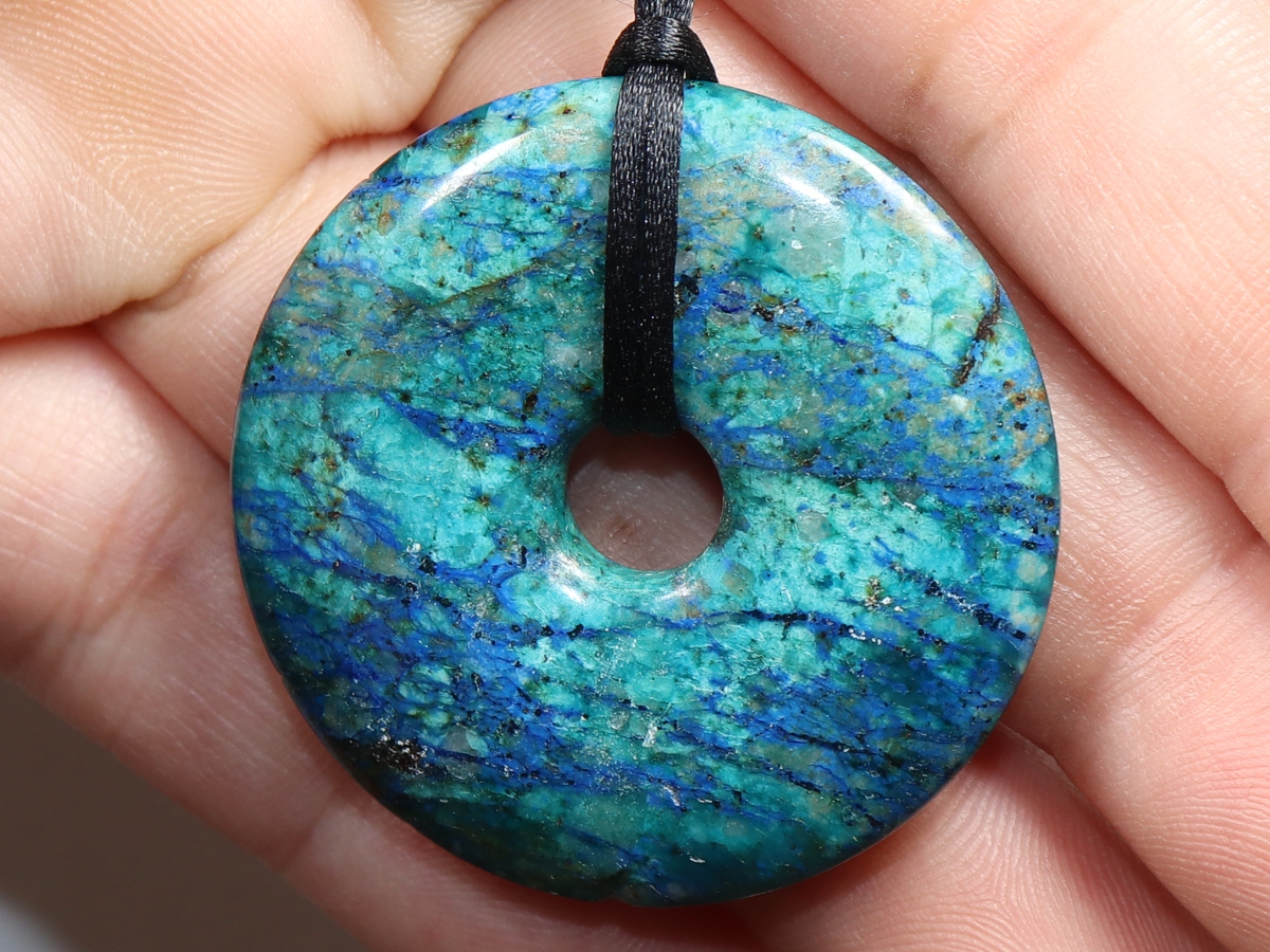 The necklace with the donut made of chrysocolla-lapis and a black cord will be individualized according to your specifications. The closure is made of stainless steel.