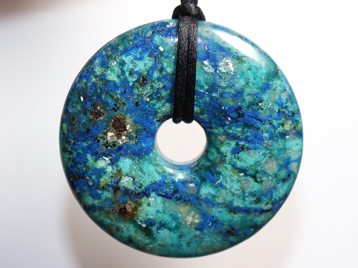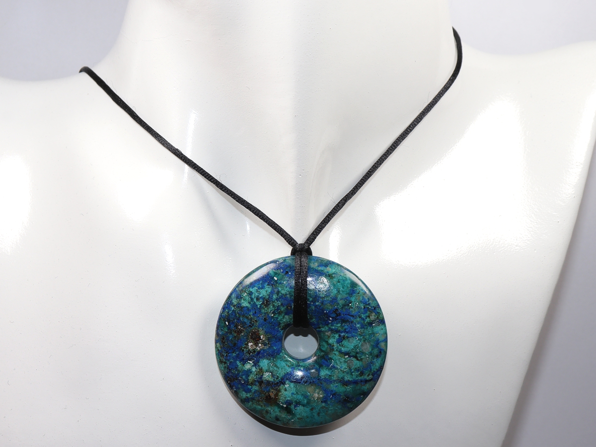 The necklace with the donut made of chrysocolla-lapis and a black cord will be individualized according to your specifications. The closure is made of stainless steel.