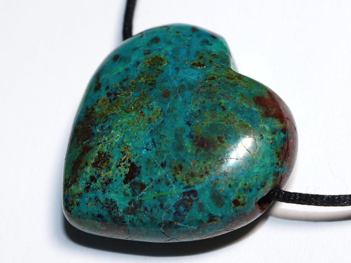 The necklace with the heart made of chrysocolla will be individualized according to your specifications. You have the choice between a black cord with a closure made of stainless steel or a chain made of silver 925.