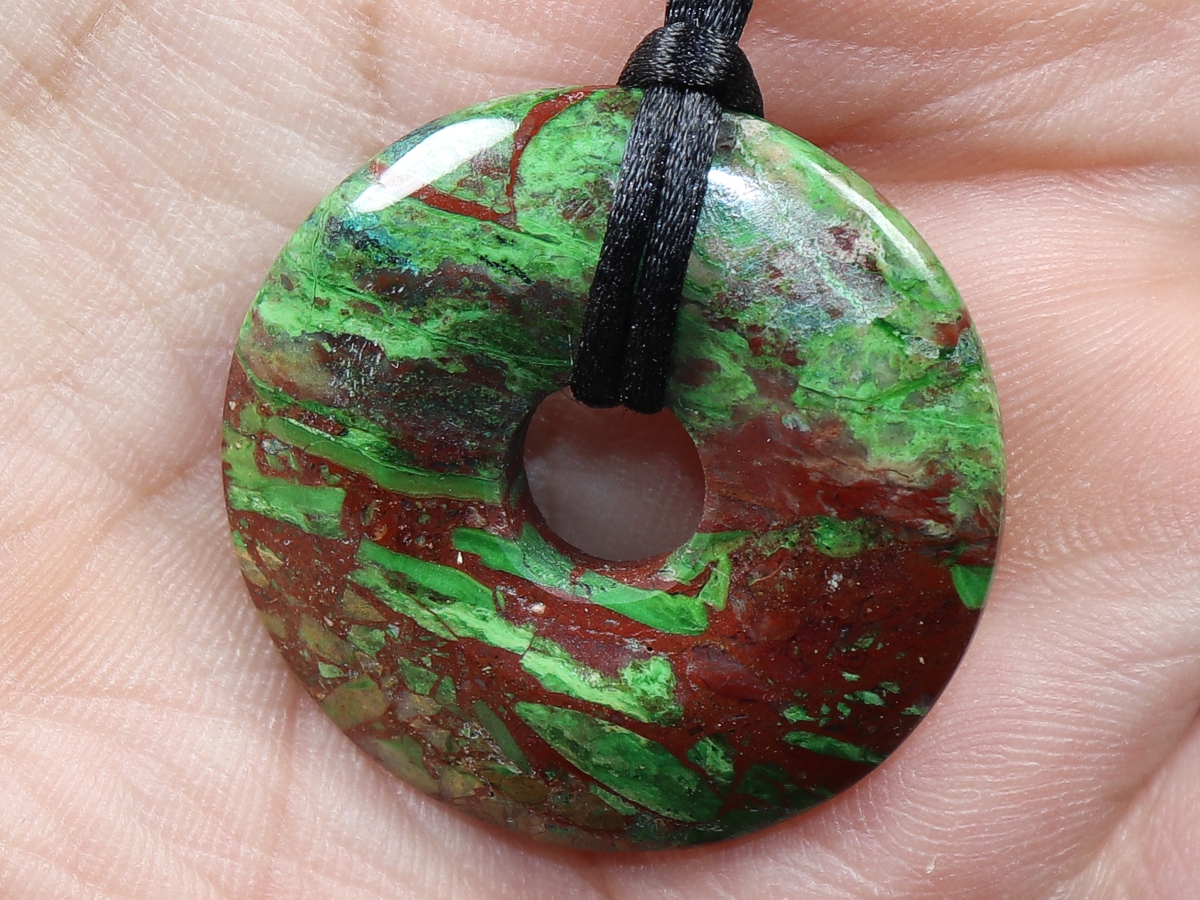 The necklace with the donut made of chrysocolla with cuprite and a black cord will be individualized according to your specifications. The closure is made of stainless steel.