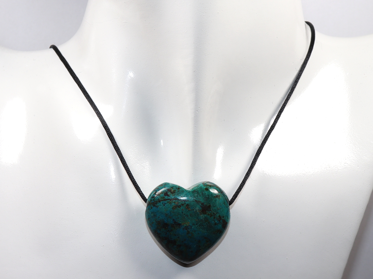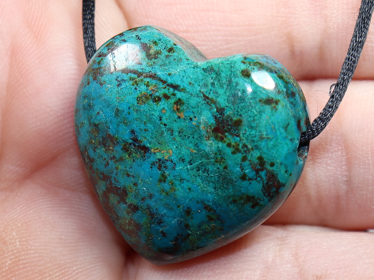 The necklace with the heart made of chrysocolla with cuprite will be individualized according to your specifications. You have the choice between a black cord with a closure made of stainless steel or a chain made of silver 925.