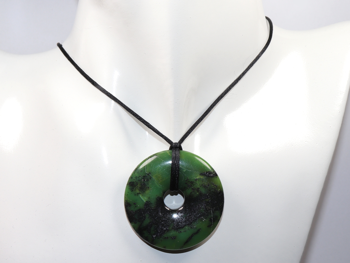 The necklace with the donut made of chrysoprase and a black cord will be individualized according to your specifications. The closure is made of stainless steel.