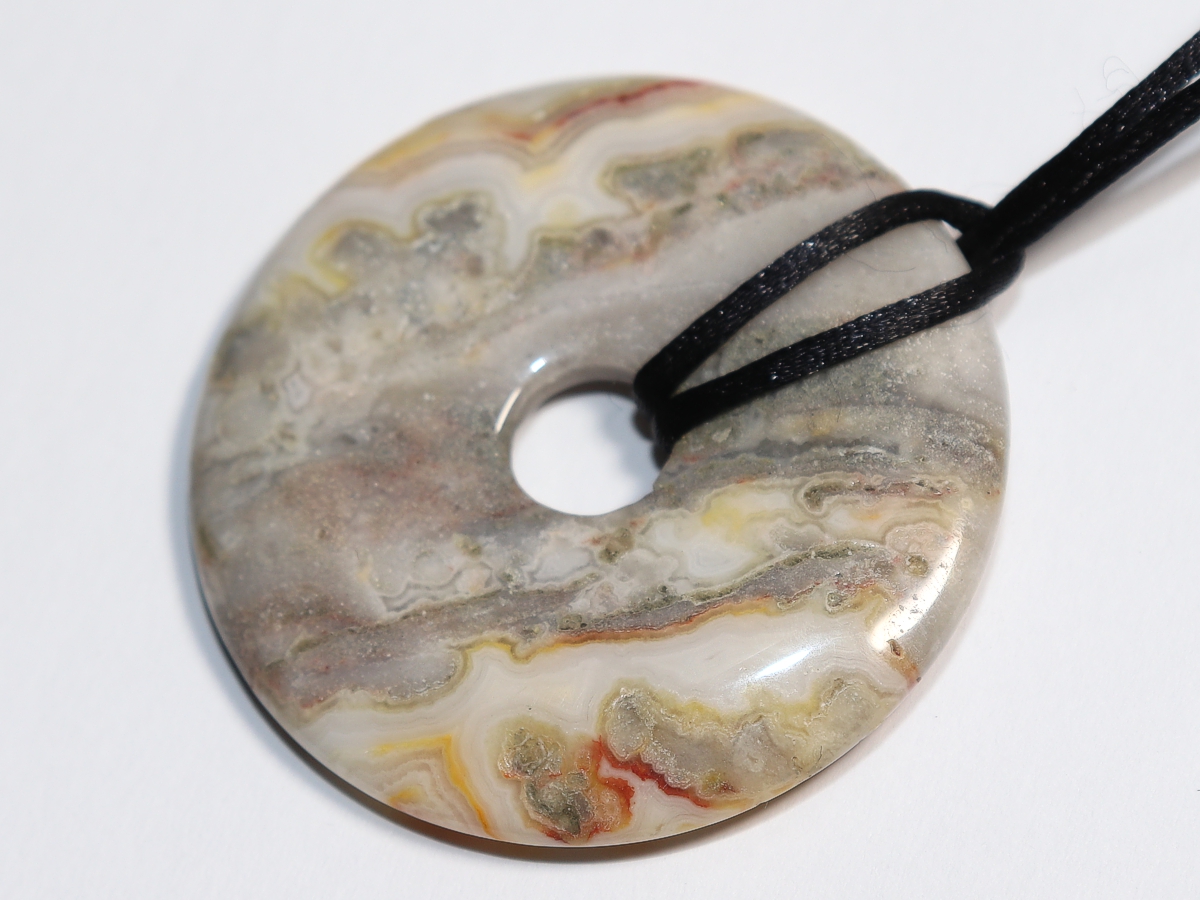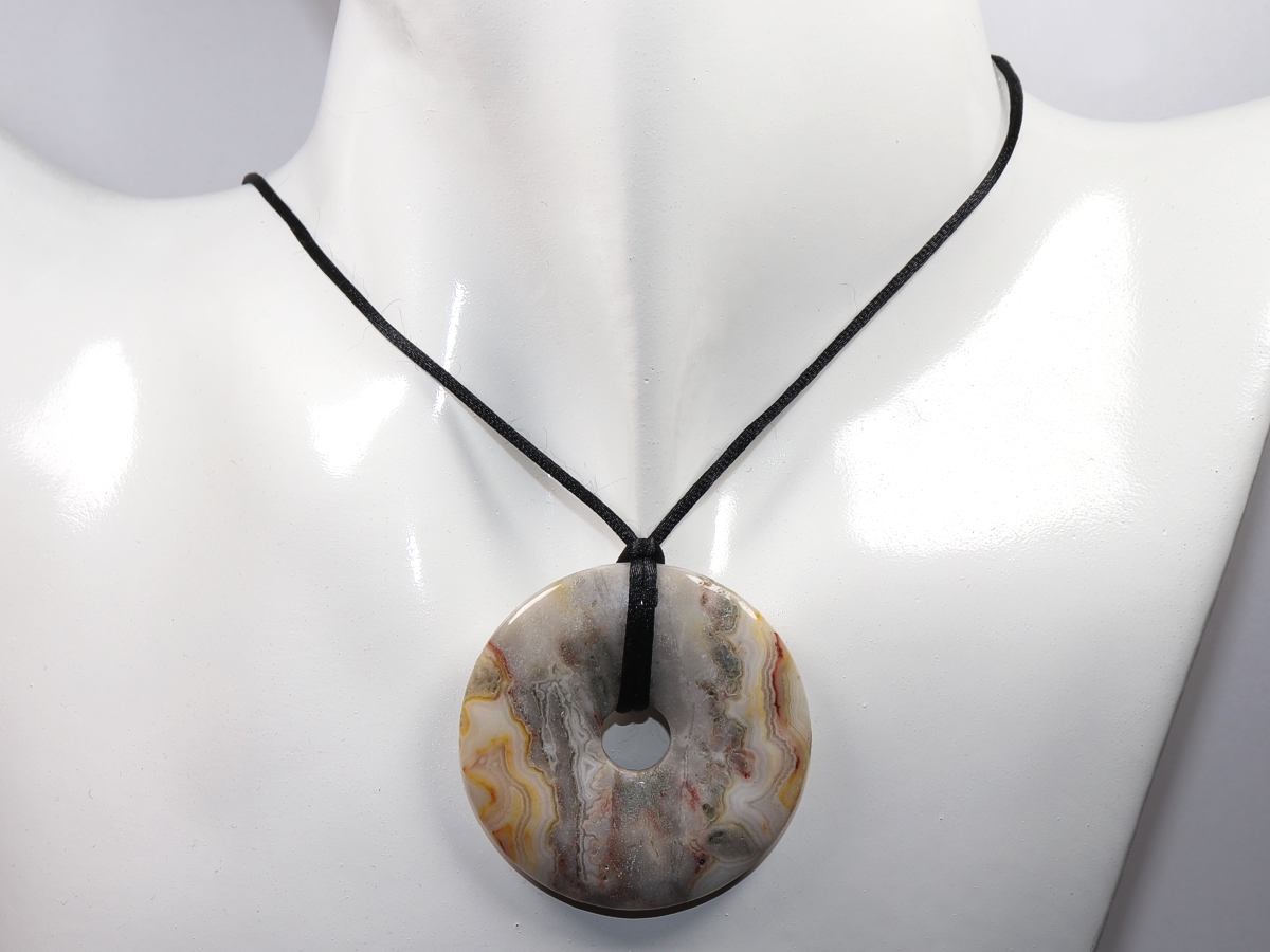 The necklace with the donut made of crazy lace agate and a black cord will be individualized according to your specifications. The closure is made of stainless steel.
