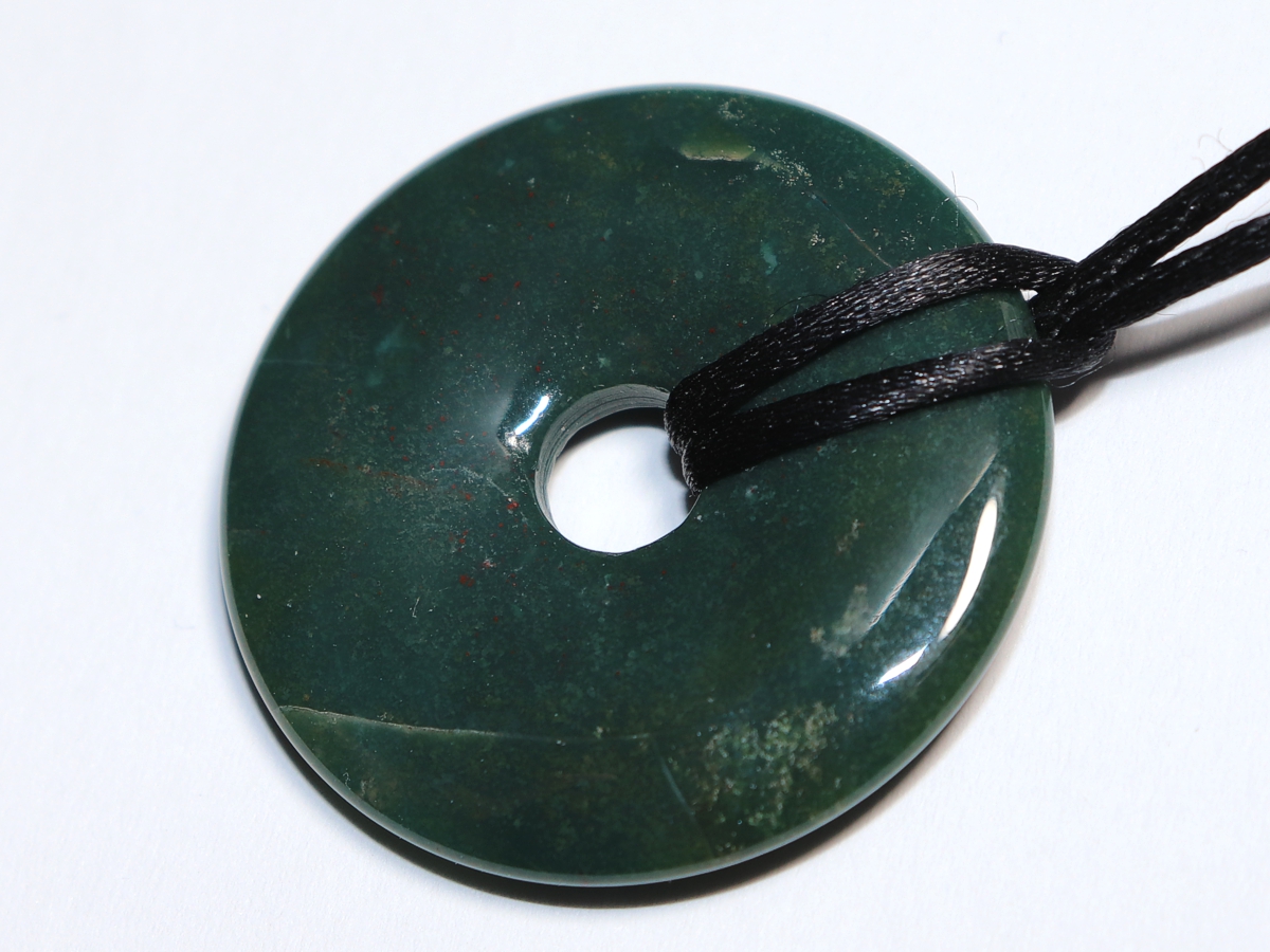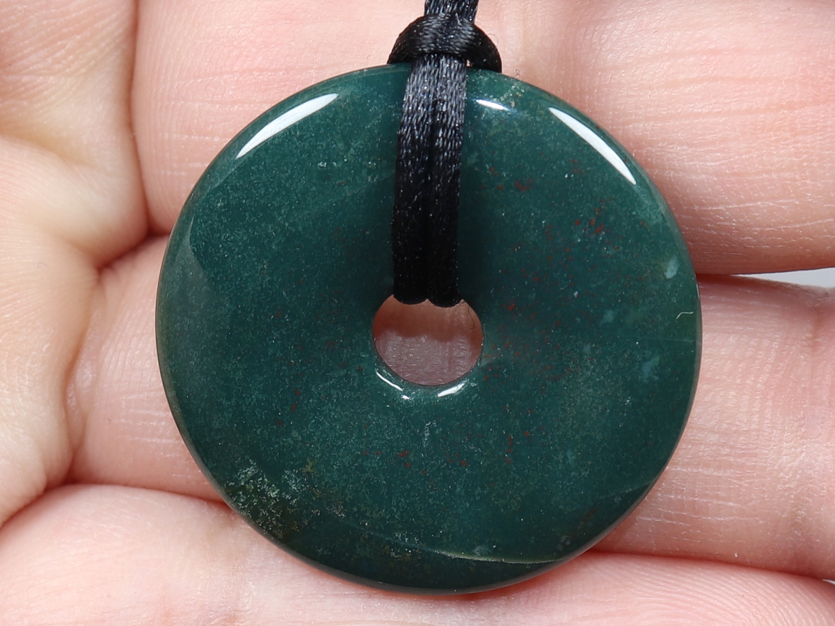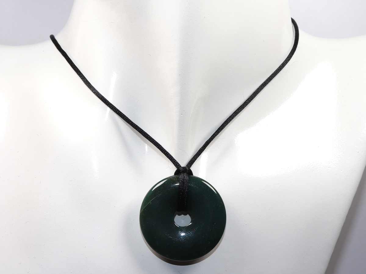The necklace with the donut made of heliotrope and a black cord will be individualized according to your specifications. The closure is made of stainless steel.