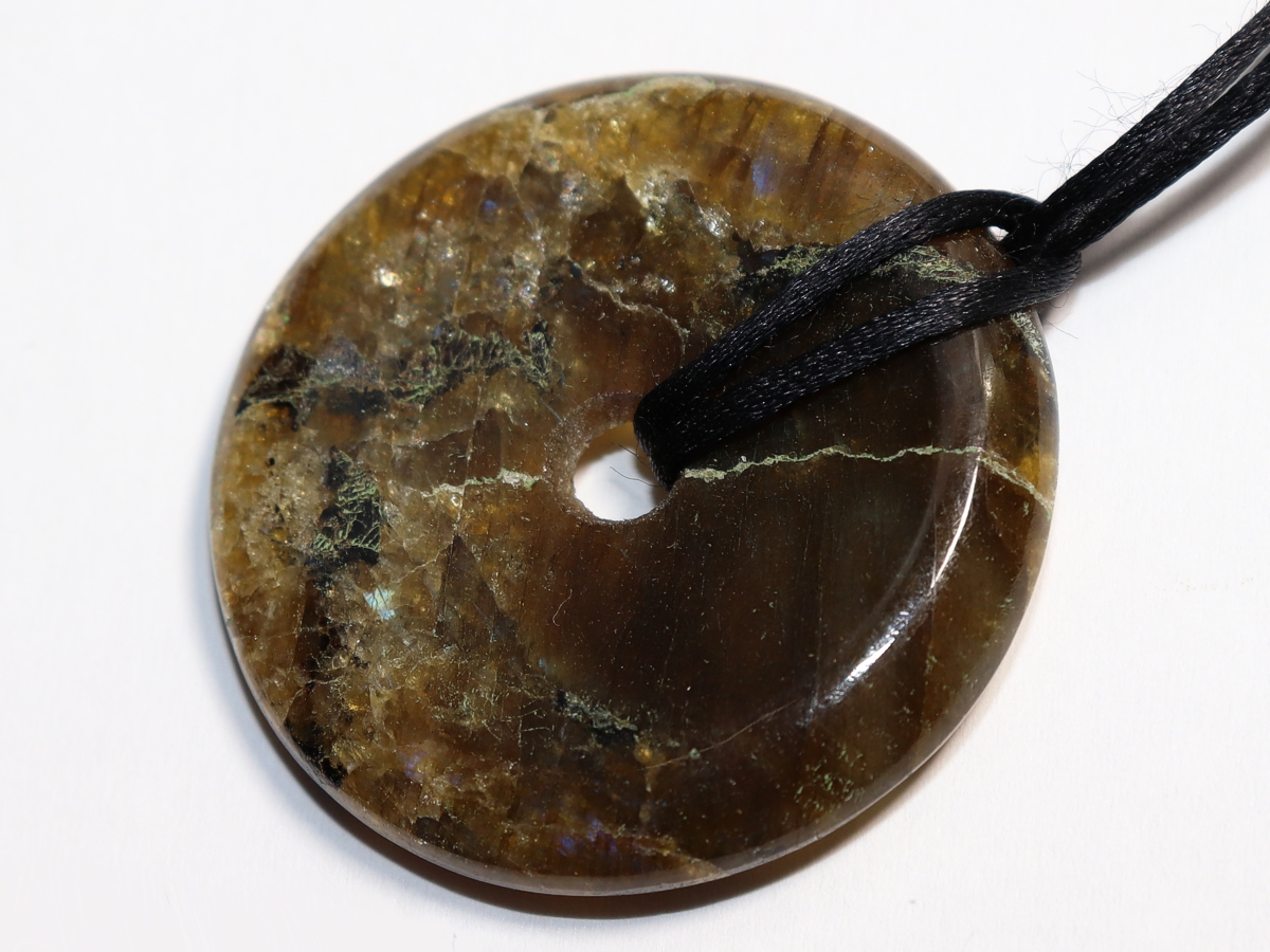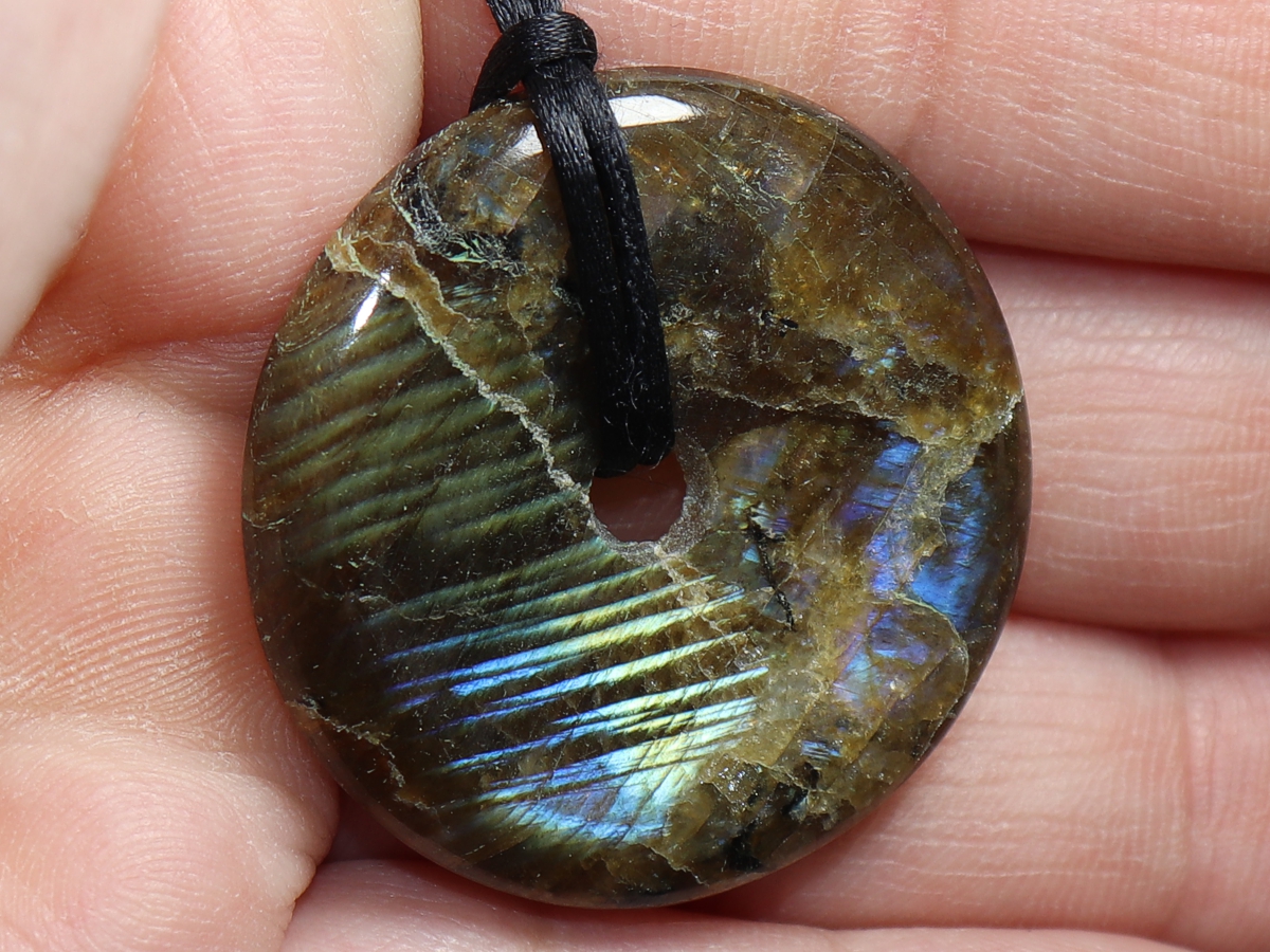 The necklace with the donut made of labradorite and a black cord will be individualized according to your specifications. The closure is made of stainless steel.