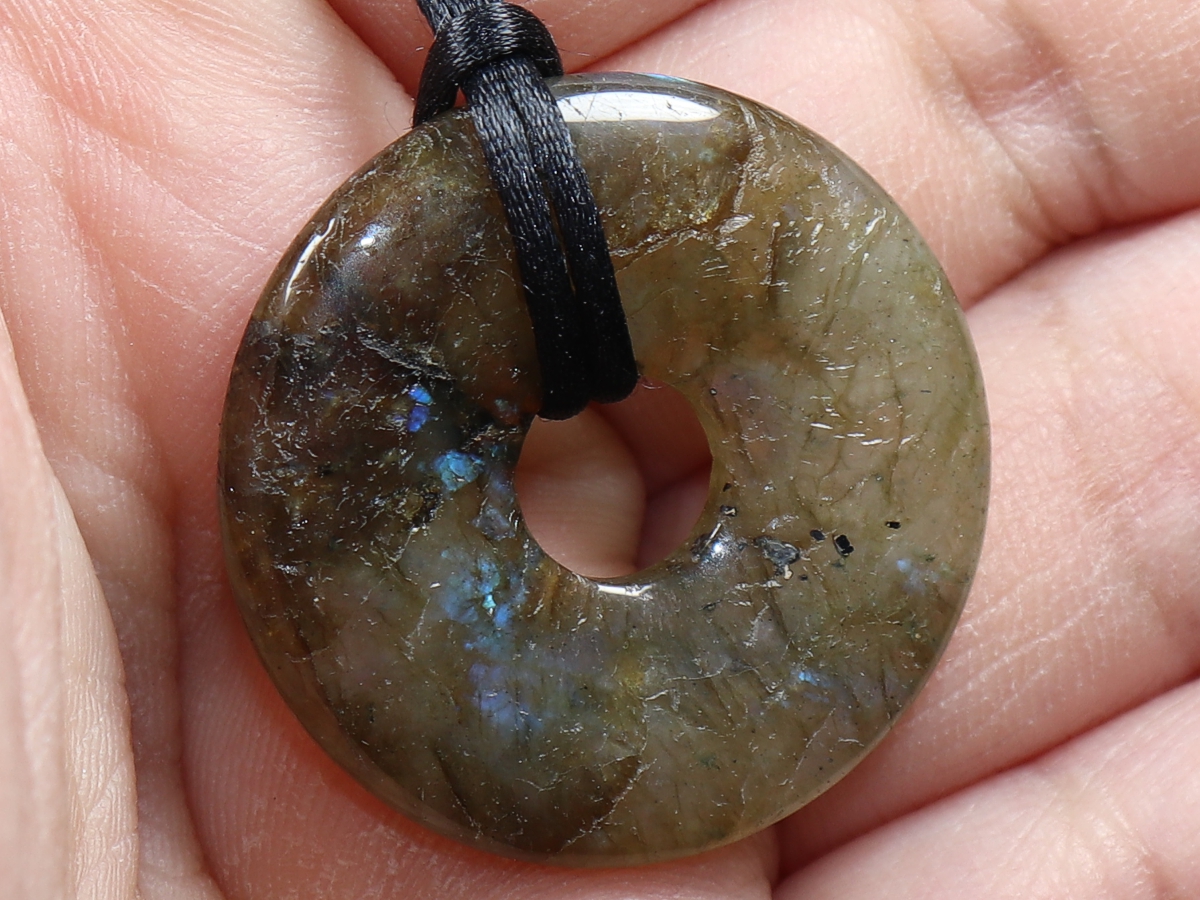 The necklace with the donut made of labradorite and a black cord will be individualized according to your specifications. The closure is made of stainless steel.