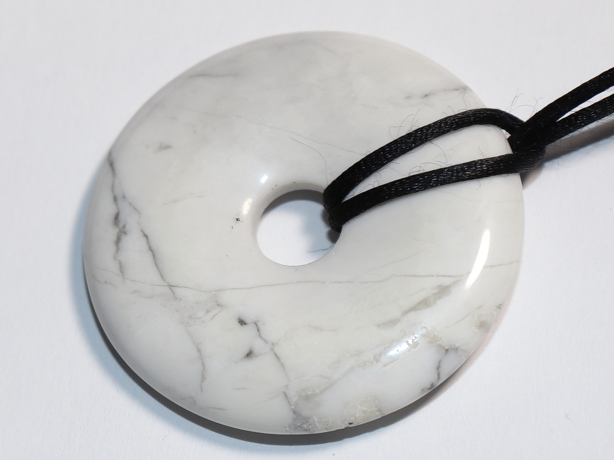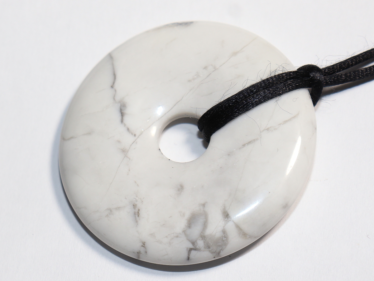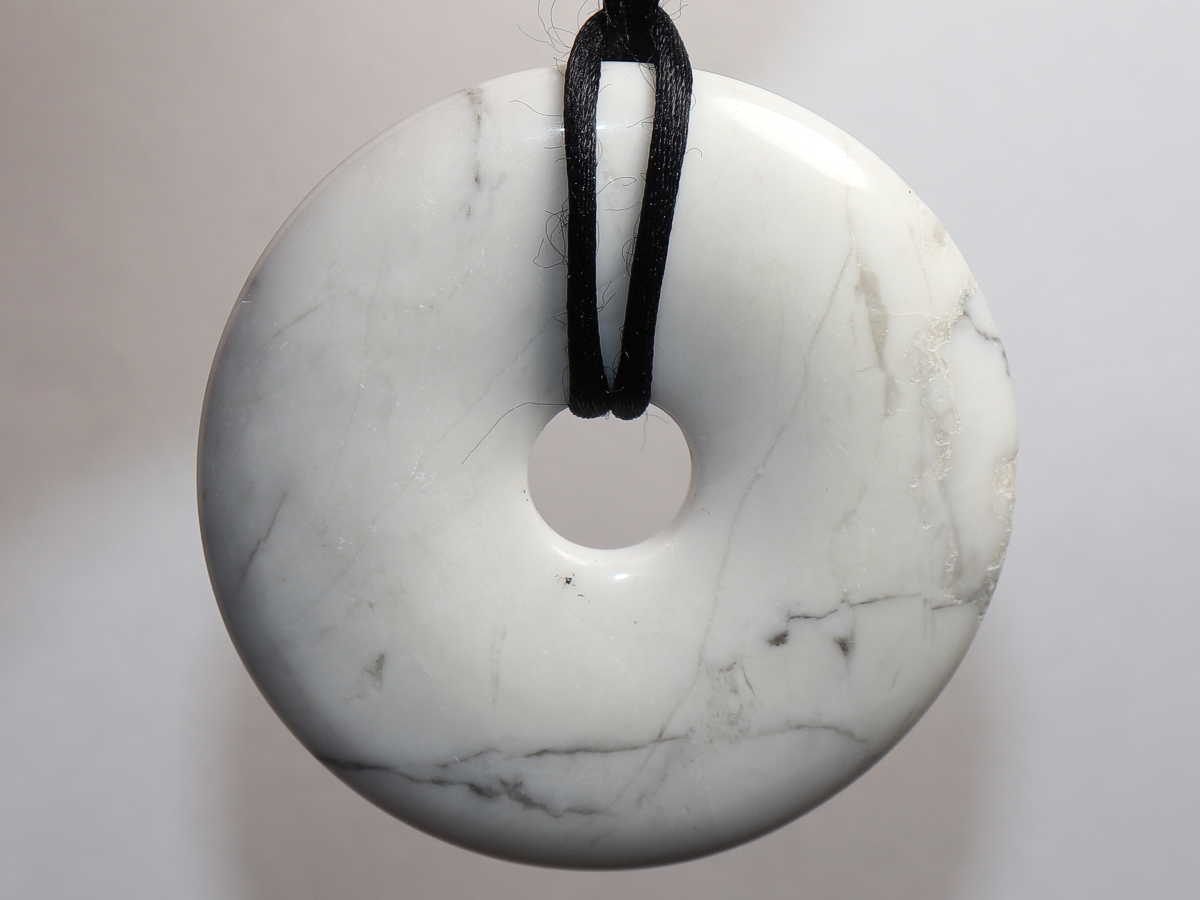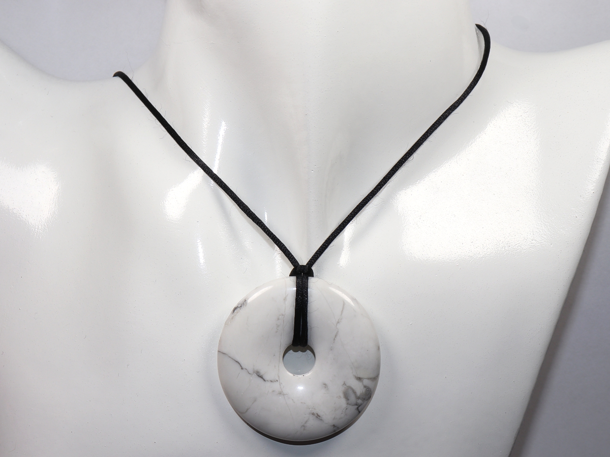 The necklace with the donut made of magnesite and a black cord will be individualized according to your specifications. The closure is made of stainless steel.