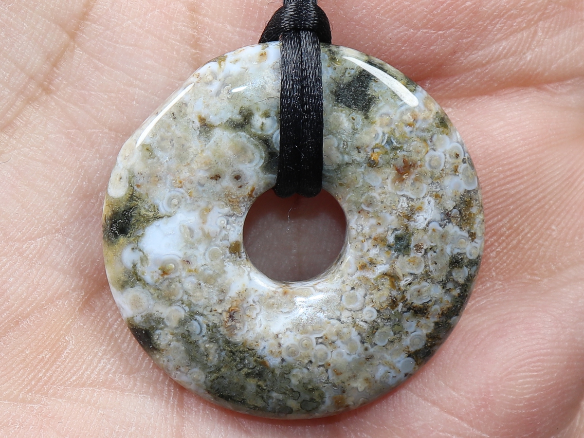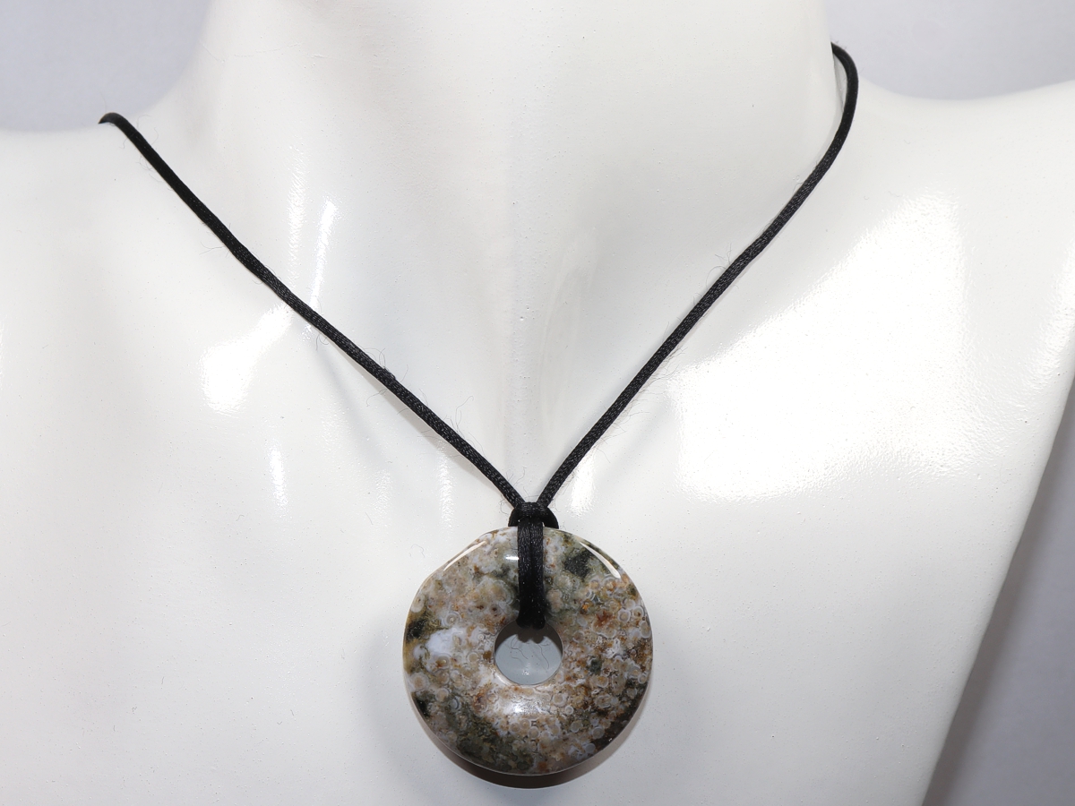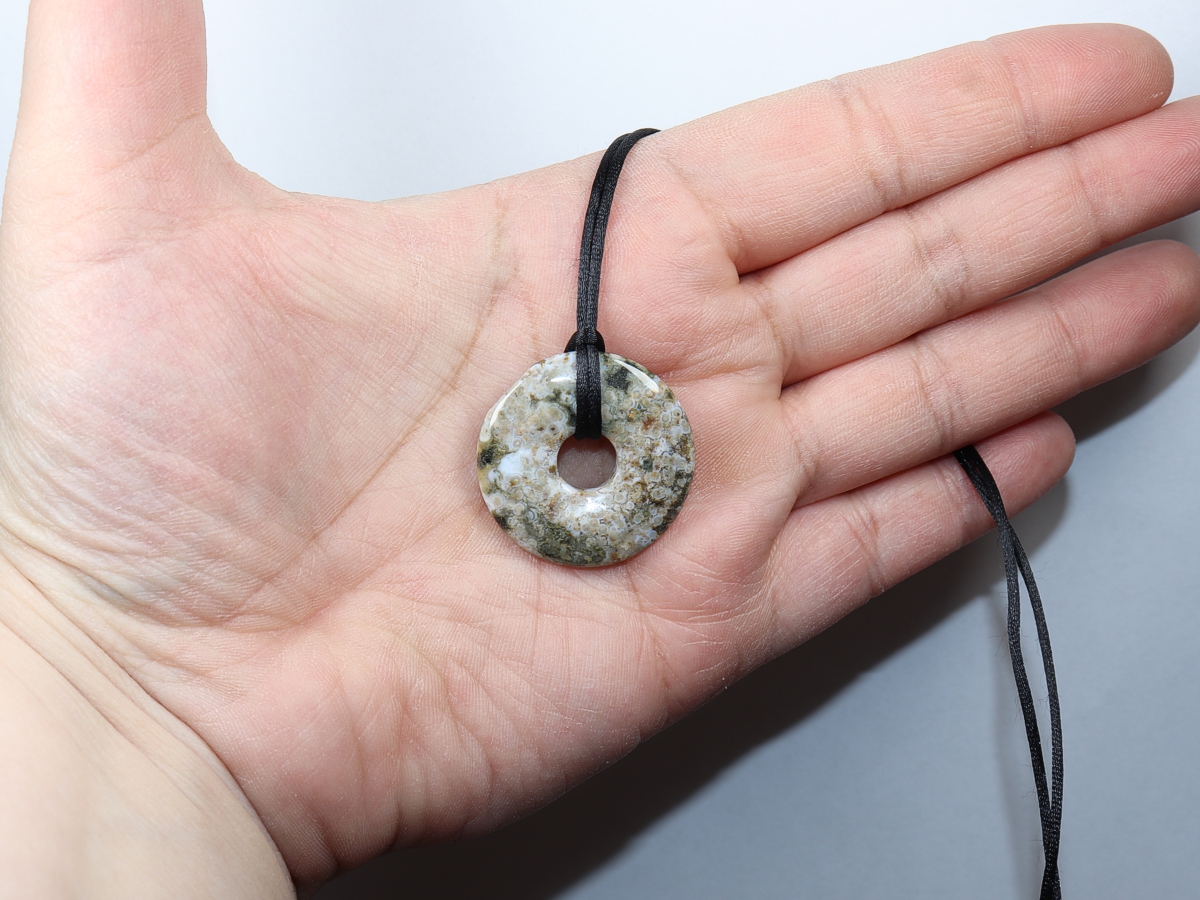 The necklace with the donut made of ocean jasper and a black cord will be individualized according to your specifications. The closure is made of stainless steel.