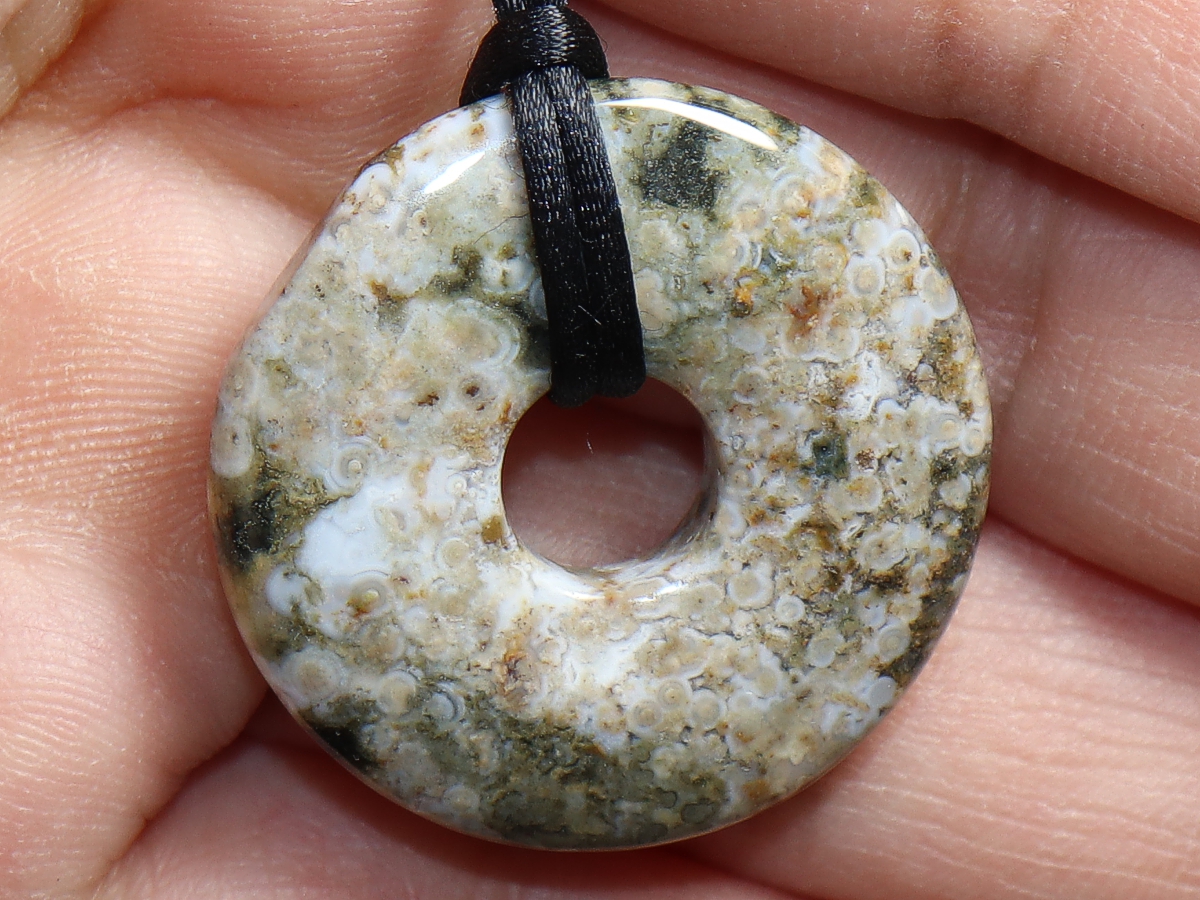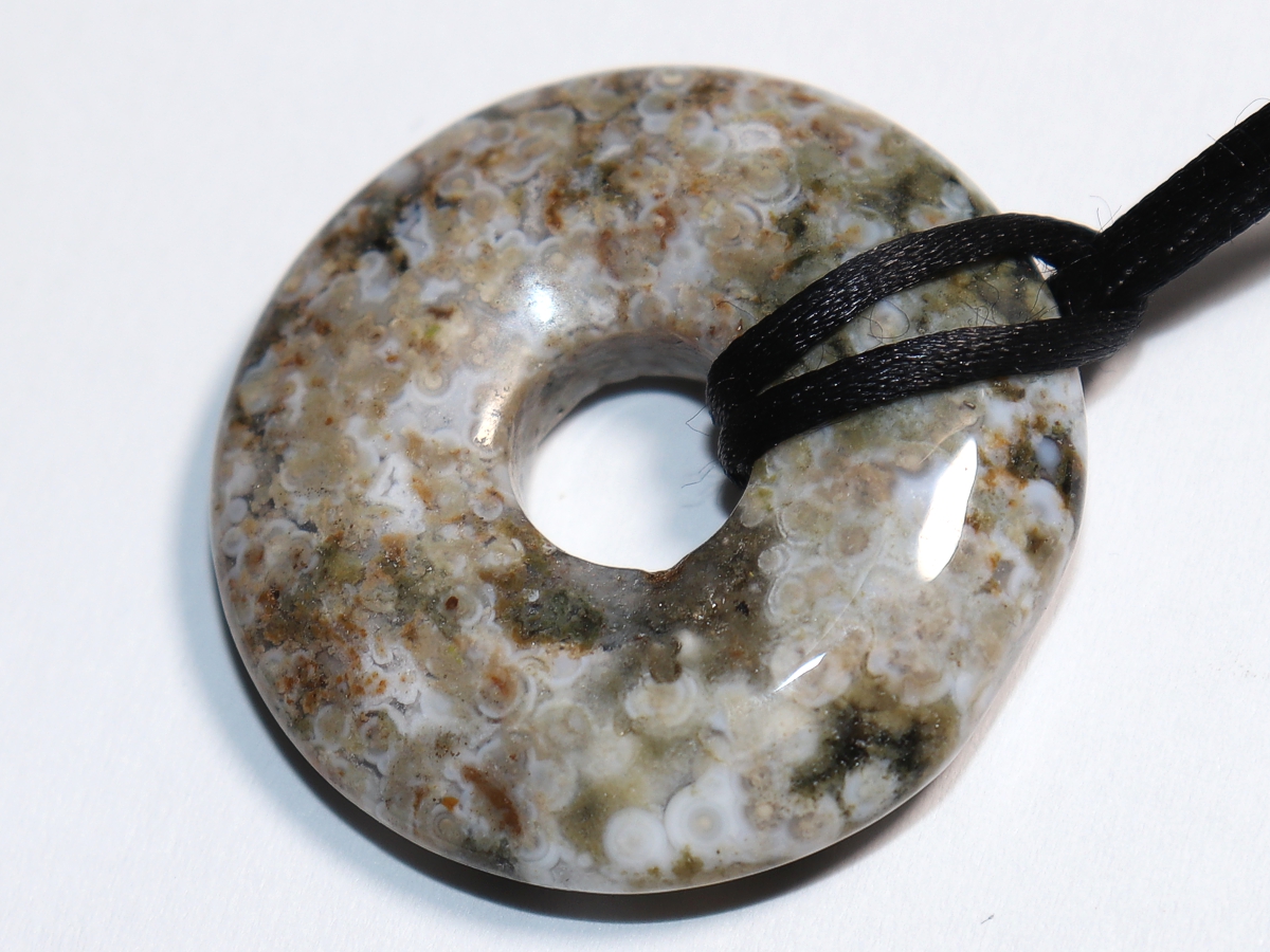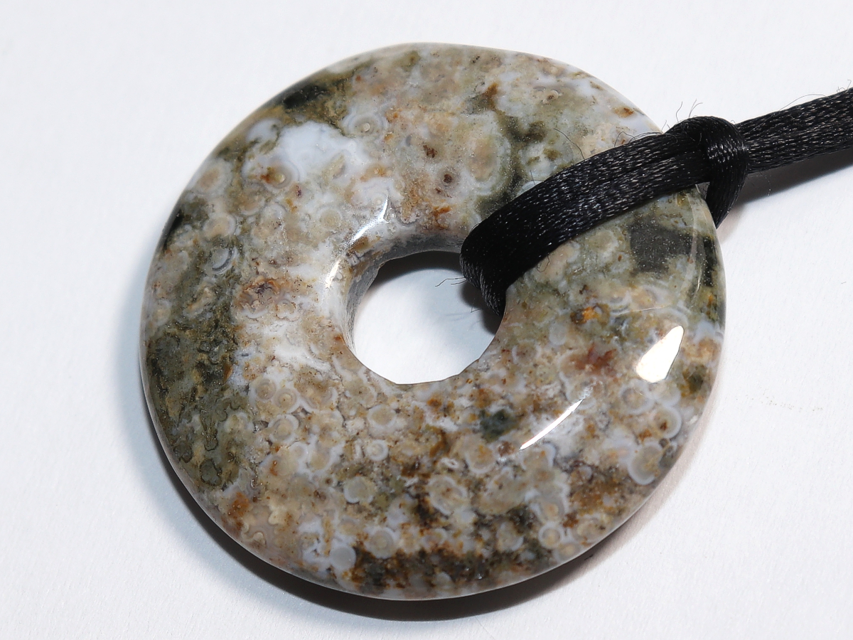 The necklace with the donut made of ocean jasper and a black cord will be individualized according to your specifications. The closure is made of stainless steel.