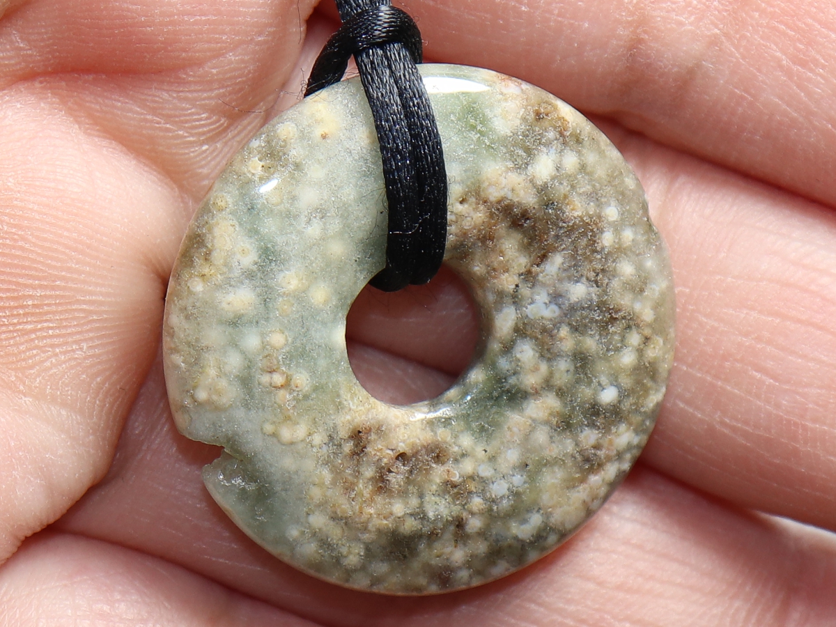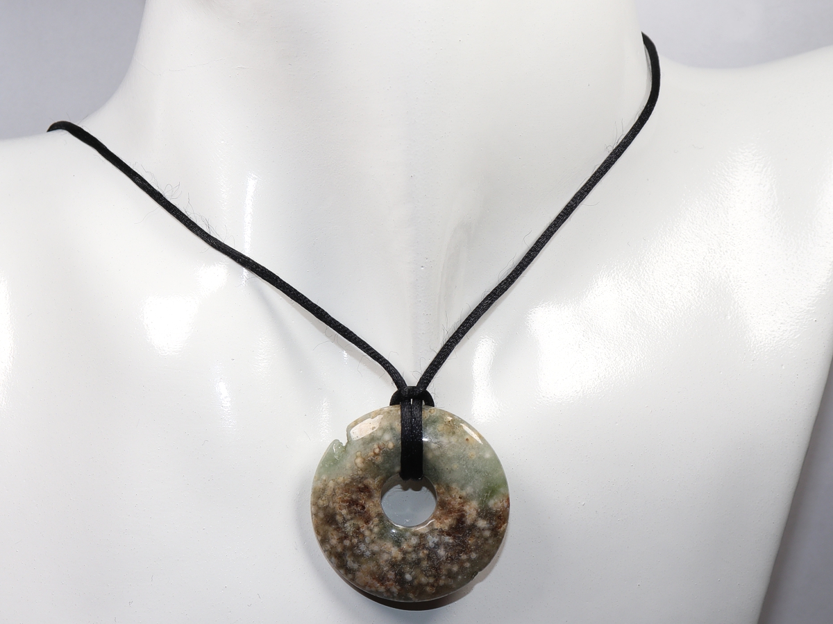 The necklace with the donut made of ocean jasper and a black cord will be individualized according to your specifications. The closure is made of stainless steel.