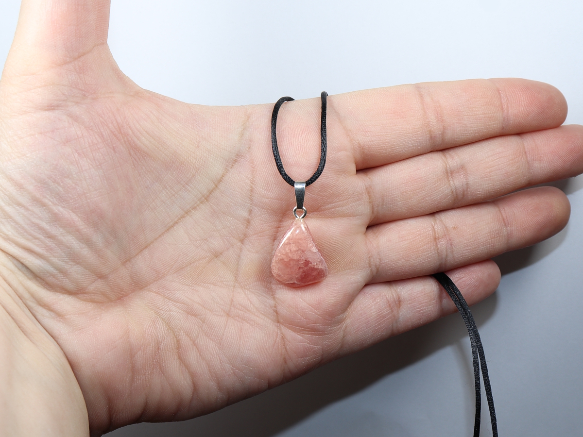The necklace with rhodochrosite will be individualized according to your specifications. You have the choice between a black cord with a closure made of stainless steel or a chain made of silver 925.