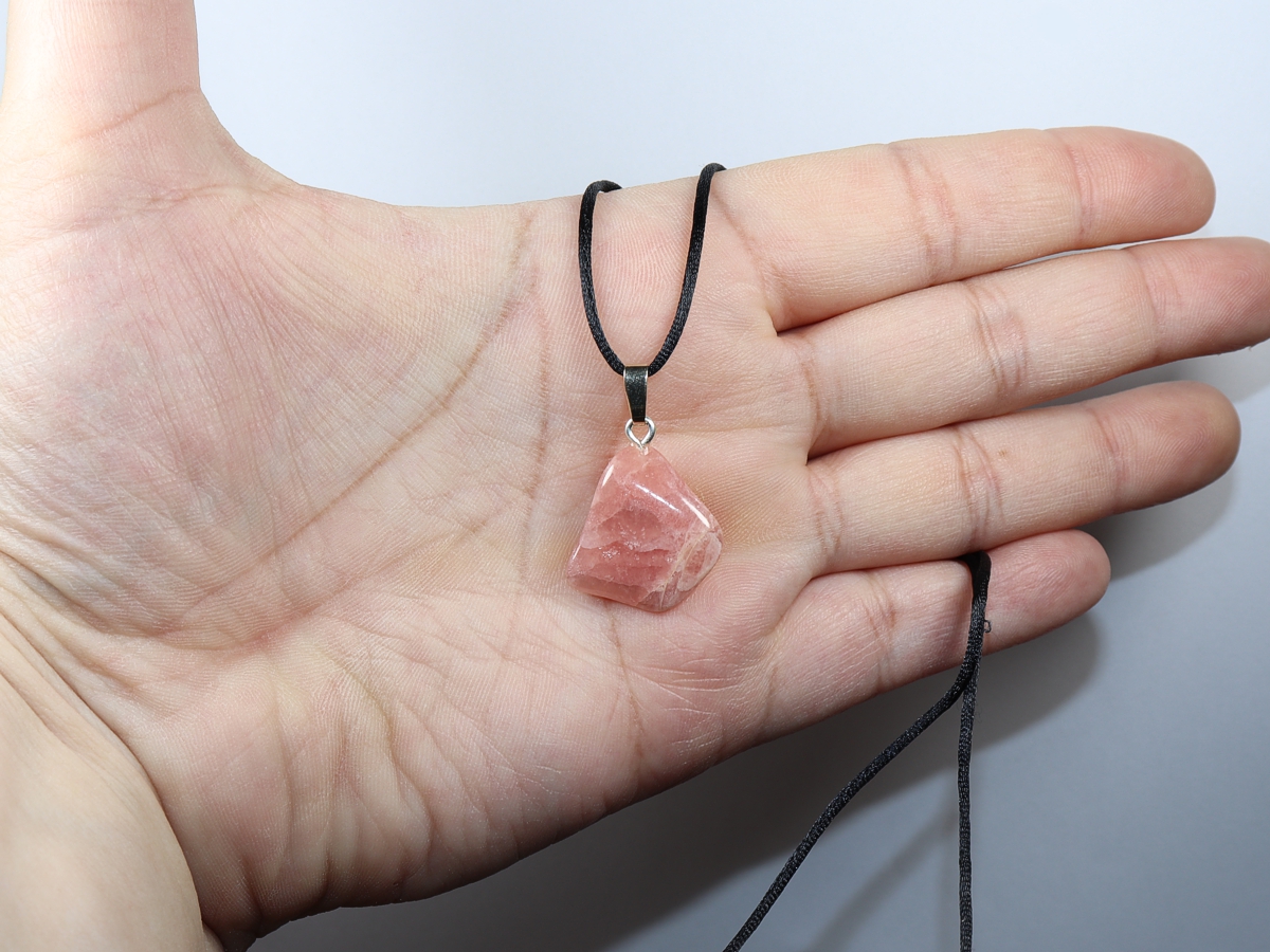 The necklace with rhodochrosite will be individualized according to your specifications. You have the choice between a black cord with a closure made of stainless steel or a chain made of silver 925.