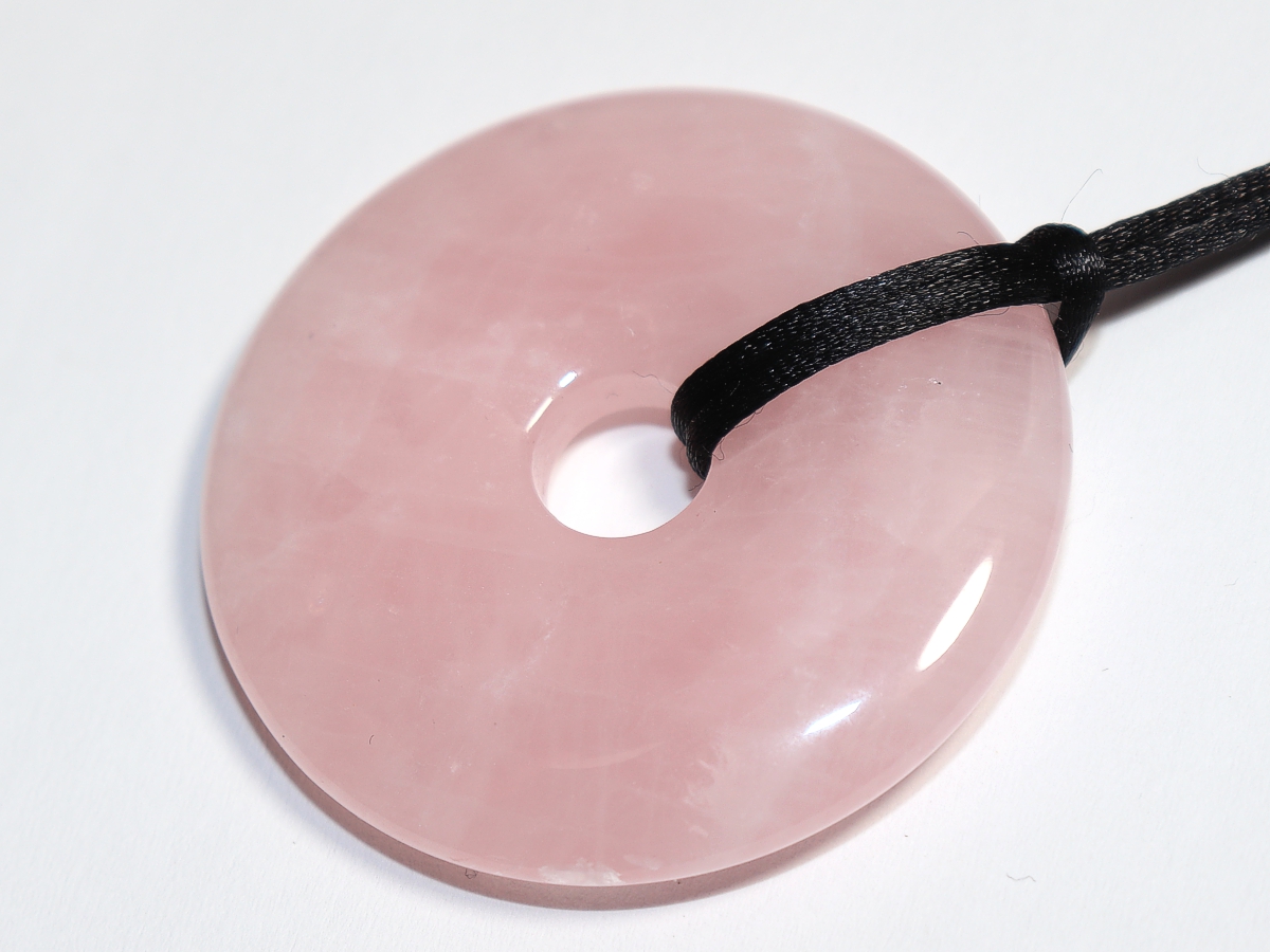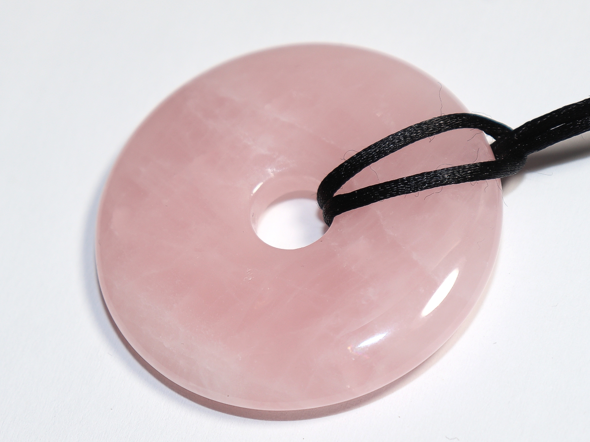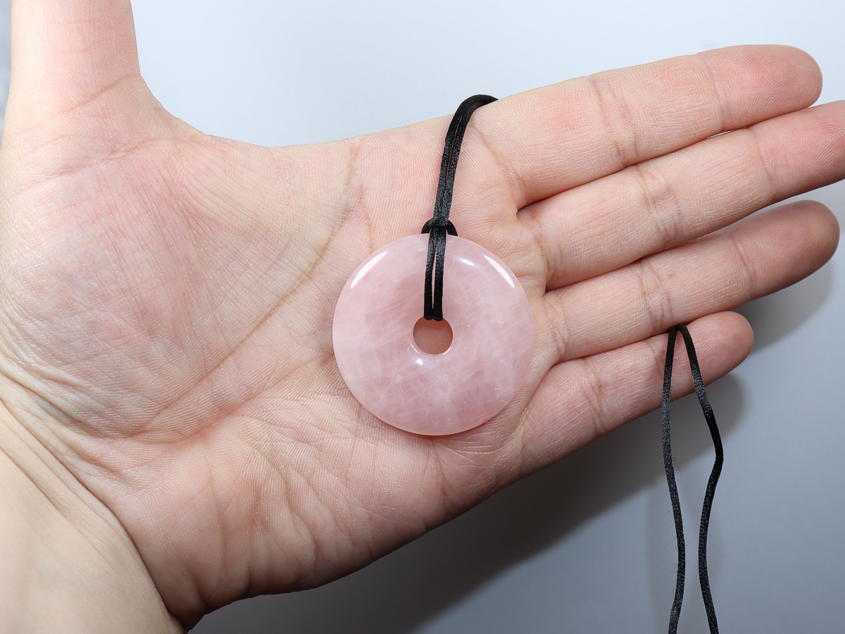The necklace with the donut made of rose quartz and a black cord will be individualized according to your specifications. The closure is made of stainless steel.