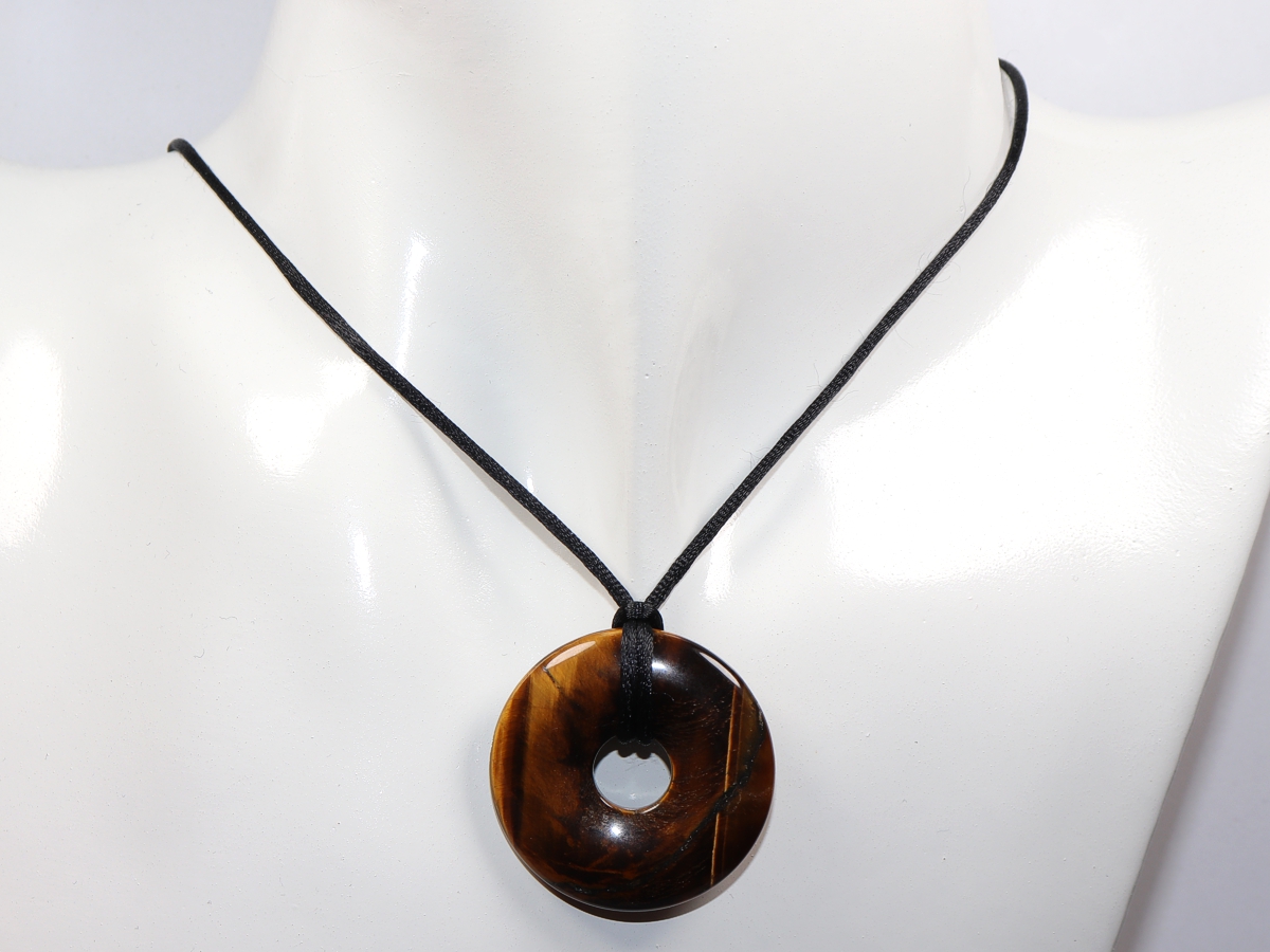 The necklace with the donut made of tiger's eye and a black cord will be individualized according to your specifications. The closure is made of stainless steel.